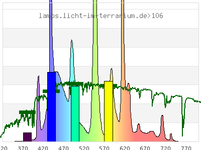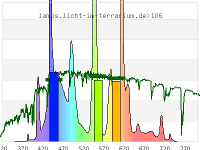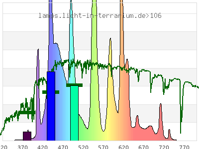 total ( 0 nm - 0 nm) 22400 µW/cm² = 224 W/m² UVC ( 0 nm - 280 nm) 0 µW/cm² = 0 W/m² non-terrestrial ( 0 nm - 290 nm) 0 µW/cm² = 0 W/m² total2 ( 250 nm - 880 nm) 22400 µW/cm² = 224 W/m² UVB (EU) ( 280 nm - 315 nm) 0 µW/cm² = 0 W/m² UVB (US) ( 280 nm - 320 nm) 0 µW/cm² = 0 W/m² UVA+B ( 280 nm - 380 nm) 32.5 µW/cm² = 0.325 W/m² Solar UVB ( 290 nm - 315 nm) 0 µW/cm² = 0 W/m² UVA D3 regulating ( 315 nm - 335 nm) 0 µW/cm² = 0 W/m² UVA (EU) ( 315 nm - 380 nm) 32.5 µW/cm² = 0.325 W/m² UVA2 (medical definition) ( 320 nm - 340 nm) 0 µW/cm² = 0 W/m² UVA (US) ( 320 nm - 380 nm) 32.5 µW/cm² = 0.325 W/m² UVA1 (variant) ( 335 nm - 380 nm) 32.5 µW/cm² = 0.325 W/m² UVA1 (medical) ( 340 nm - 400 nm) 118 µW/cm² = 1.18 W/m² vis. UVA ( 350 nm - 380 nm) 32.5 µW/cm² = 0.325 W/m² VIS Rep3 ( 350 nm - 600 nm) 16900 µW/cm² = 169 W/m² VIS Rep4 ( 350 nm - 700 nm) 21900 µW/cm² = 219 W/m² purple ( 380 nm - 420 nm) 897 µW/cm² = 8.97 W/m² VIS ( 380 nm - 780 nm) 22400 µW/cm² = 224 W/m² VIS2 ( 400 nm - 680 nm) 21600 µW/cm² = 216 W/m² PAR ( 400 nm - 700 nm) 21800 µW/cm² = 218 W/m² tmp ( 400 nm - 1100 nm) 22300 µW/cm² = 223 W/m² blue ( 420 nm - 490 nm) 7070 µW/cm² = 70.7 W/m² green ( 490 nm - 575 nm) 7300 µW/cm² = 73 W/m² yellow ( 575 nm - 585 nm) 611 µW/cm² = 6.11 W/m² orange ( 585 nm - 650 nm) 5280 µW/cm² = 52.8 W/m² red ( 650 nm - 780 nm) 1200 µW/cm² = 12 W/m² IR2 ( 655 nm - 685 nm) 426 µW/cm² = 4.26 W/m² IRA ( 700 nm - 1400 nm) 486 µW/cm² = 4.86 W/m² IRB ( 1400 nm - 3000 nm) 0 µW/cm² = 0 W/m²