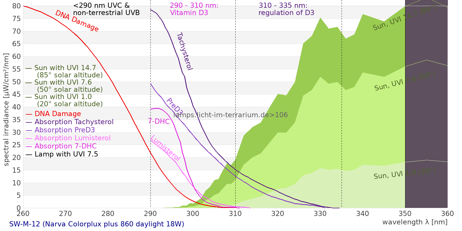 This process prevents any overdose of vitamin D3 from UV radiation with a spectrum similar to sunlight. As a comparison the solar spectra at 20°(id:14) and at 85°(id:21) solar angle are shown.