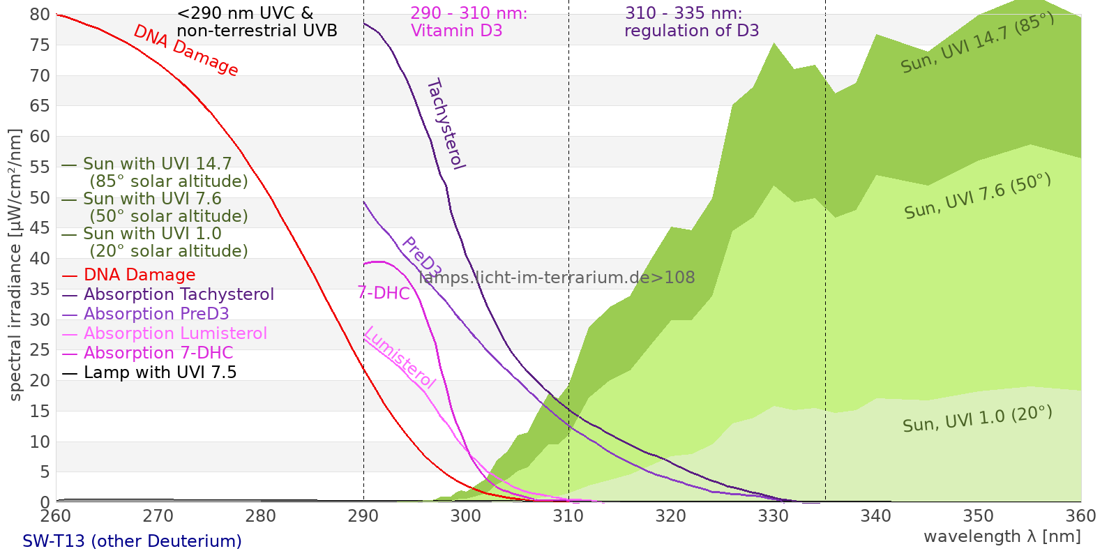 This process prevents any overdose of vitamin D3 from UV radiation with a spectrum similar to sunlight. As a comparison the solar spectra at 20°(id:14) and at 85°(id:21) solar angle are shown.