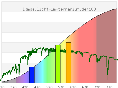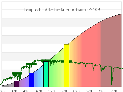 Whereas a spectrometer measures the intensity in every tiny wavelength interval resulting in thousands of individual intensities, the human eye only measures three intensities detected by the three cones. The same is true for the reptile eye with usually three or four photoreceptors. Effectively the detailled spectrum displayed above reduces to a much compacter bar graph displayed below. The photoreceptor sensitivites from these L-Cone, M-Cone, S-Cone, and U-Cone are used, they are chosen as an average of measured reptile photoreceptor sensitivity curves. The bar graph also shows as reference the intensity seen by the three or four photoreceptors for average sunlight (ASTM spectrum).