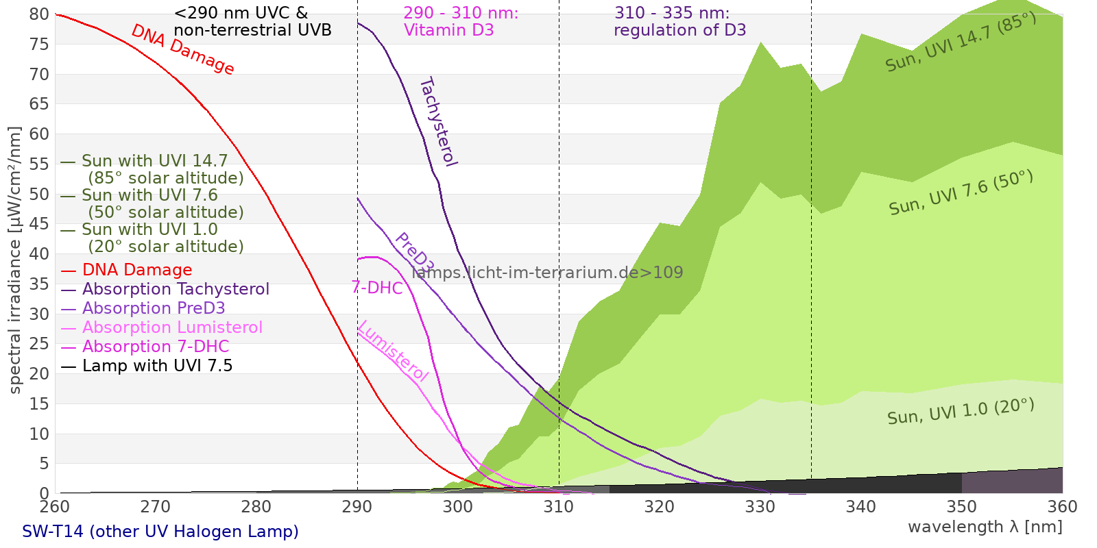 This process prevents any overdose of vitamin D3 from UV radiation with a spectrum similar to sunlight. As a comparison the solar spectra at 20°(id:14) and at 85°(id:21) solar angle are shown.