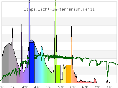 total ( 0 nm - 0 nm) 880 µW/cm² = 8.8 W/m² UVC ( 0 nm - 280 nm) 0.882 µW/cm² = 0.00882 W/m² non-terrestrial ( 0 nm - 290 nm) 1.18 µW/cm² = 0.0118 W/m² total2 ( 250 nm - 880 nm) 880 µW/cm² = 8.8 W/m² UVB (EU) ( 280 nm - 315 nm) 20.3 µW/cm² = 0.203 W/m² UVB (US) ( 280 nm - 320 nm) 31.6 µW/cm² = 0.316 W/m² UVA+B ( 280 nm - 380 nm) 246 µW/cm² = 2.46 W/m² Solar UVB ( 290 nm - 315 nm) 20 µW/cm² = 0.2 W/m² UVA D3 regulating ( 315 nm - 335 nm) 57.3 µW/cm² = 0.573 W/m² UVA (EU) ( 315 nm - 380 nm) 226 µW/cm² = 2.26 W/m² UVA2 (medical definition) ( 320 nm - 340 nm) 65.2 µW/cm² = 0.652 W/m² UVA (US) ( 320 nm - 380 nm) 215 µW/cm² = 2.15 W/m² UVA1 (variant) ( 335 nm - 380 nm) 169 µW/cm² = 1.69 W/m² UVA1 (medical) ( 340 nm - 400 nm) 185 µW/cm² = 1.85 W/m² vis. UVA ( 350 nm - 380 nm) 110 µW/cm² = 1.1 W/m² VIS Rep3 ( 350 nm - 600 nm) 675 µW/cm² = 6.75 W/m² VIS Rep4 ( 350 nm - 700 nm) 736 µW/cm² = 7.36 W/m² purple ( 380 nm - 420 nm) 75.2 µW/cm² = 0.752 W/m² VIS ( 380 nm - 780 nm) 633 µW/cm² = 6.33 W/m² VIS2 ( 400 nm - 680 nm) 587 µW/cm² = 5.87 W/m² PAR ( 400 nm - 700 nm) 590 µW/cm² = 5.9 W/m² tmp ( 400 nm - 1100 nm) 597 µW/cm² = 5.97 W/m² blue ( 420 nm - 490 nm) 285 µW/cm² = 2.85 W/m² green ( 490 nm - 575 nm) 174 µW/cm² = 1.74 W/m² yellow ( 575 nm - 585 nm) 15.6 µW/cm² = 0.156 W/m² orange ( 585 nm - 650 nm) 67.7 µW/cm² = 0.677 W/m² red ( 650 nm - 780 nm) 15.6 µW/cm² = 0.156 W/m² IR2 ( 655 nm - 685 nm) 4.77 µW/cm² = 0.0477 W/m² IRA ( 700 nm - 1400 nm) 7.64 µW/cm² = 0.0764 W/m² IRB ( 1400 nm - 3000 nm) 0 µW/cm² = 0 W/m²