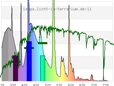 Whereas a spectrometer measures the intensity in every tiny wavelength interval resulting in thousands of individual intensities, the human eye only measures three intensities detected by the three cones. The same is true for the reptile eye with usually three or four photoreceptors. Effectively the detailled spectrum displayed above reduces to a much compacter bar graph displayed below. The photoreceptor sensitivites from these L-Cone, M-Cone, S-Cone, and U-Cone are used, they are chosen as an average of measured reptile photoreceptor sensitivity curves. The bar graph also shows as reference the intensity seen by the three or four photoreceptors for average sunlight (ASTM spectrum).