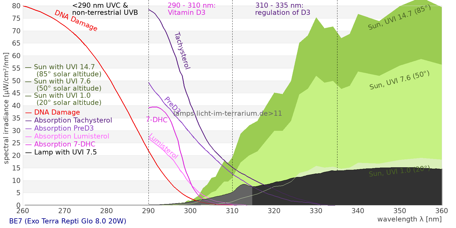 This process prevents any overdose of vitamin D3 from UV radiation with a spectrum similar to sunlight. As a comparison the solar spectra at 20°(id:14) and at 85°(id:21) solar angle are shown.