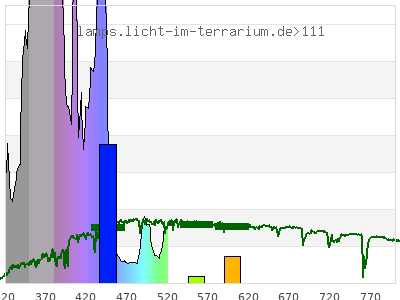 Whereas a spectrometer measures the intensity in every tiny wavelength interval resulting in thousands of individual intensities, the human eye only measures three intensities detected by the three cones. The same is true for the reptile eye with usually three or four photoreceptors. Effectively the detailled spectrum displayed above reduces to a much compacter bar graph displayed below. The photoreceptor sensitivites from these L-Cone, M-Cone, S-Cone, and U-Cone are used, they are chosen as an average of measured reptile photoreceptor sensitivity curves. The bar graph also shows as reference the intensity seen by the three or four photoreceptors for average sunlight (ASTM spectrum).