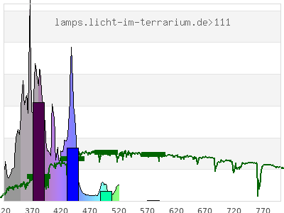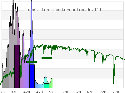 total ( 0 nm - 0 nm) 53.6 µW/cm² = 0.536 W/m² UVC ( 0 nm - 280 nm) 0.0557 µW/cm² = 0.000557 W/m² non-terrestrial ( 0 nm - 290 nm) 0.192 µW/cm² = 0.00192 W/m² total2 ( 250 nm - 880 nm) 53.6 µW/cm² = 0.536 W/m² UVB (EU) ( 280 nm - 315 nm) 3.09 µW/cm² = 0.0309 W/m² UVB (US) ( 280 nm - 320 nm) 3.74 µW/cm² = 0.0374 W/m² UVA+B ( 280 nm - 380 nm) 26.4 µW/cm² = 0.264 W/m² Solar UVB ( 290 nm - 315 nm) 2.95 µW/cm² = 0.0295 W/m² UVA D3 regulating ( 315 nm - 335 nm) 2.7 µW/cm² = 0.027 W/m² UVA (EU) ( 315 nm - 380 nm) 23.3 µW/cm² = 0.233 W/m² UVA2 (medical definition) ( 320 nm - 340 nm) 2.92 µW/cm² = 0.0292 W/m² UVA (US) ( 320 nm - 380 nm) 22.7 µW/cm² = 0.227 W/m² UVA1 (variant) ( 335 nm - 380 nm) 20.6 µW/cm² = 0.206 W/m² UVA1 (medical) ( 340 nm - 400 nm) 27.7 µW/cm² = 0.277 W/m² vis. UVA ( 350 nm - 380 nm) 16.4 µW/cm² = 0.164 W/m² VIS Rep3 ( 350 nm - 600 nm) 43.6 µW/cm² = 0.436 W/m² VIS Rep4 ( 350 nm - 700 nm) 43.6 µW/cm² = 0.436 W/m² purple ( 380 nm - 420 nm) 13.4 µW/cm² = 0.134 W/m² VIS ( 380 nm - 780 nm) 27.2 µW/cm² = 0.272 W/m² VIS2 ( 400 nm - 680 nm) 19.2 µW/cm² = 0.192 W/m² PAR ( 400 nm - 700 nm) 19.2 µW/cm² = 0.192 W/m² tmp ( 400 nm - 1100 nm) 19.2 µW/cm² = 0.192 W/m² blue ( 420 nm - 490 nm) 12.1 µW/cm² = 0.121 W/m² green ( 490 nm - 575 nm) 1.68 µW/cm² = 0.0168 W/m² yellow ( 575 nm - 585 nm) 0 µW/cm² = 0 W/m² orange ( 585 nm - 650 nm) 0 µW/cm² = 0 W/m² red ( 650 nm - 780 nm) 0 µW/cm² = 0 W/m² IR2 ( 655 nm - 685 nm) 0 µW/cm² = 0 W/m² IRA ( 700 nm - 1400 nm) 0 µW/cm² = 0 W/m² IRB ( 1400 nm - 3000 nm) 0 µW/cm² = 0 W/m²