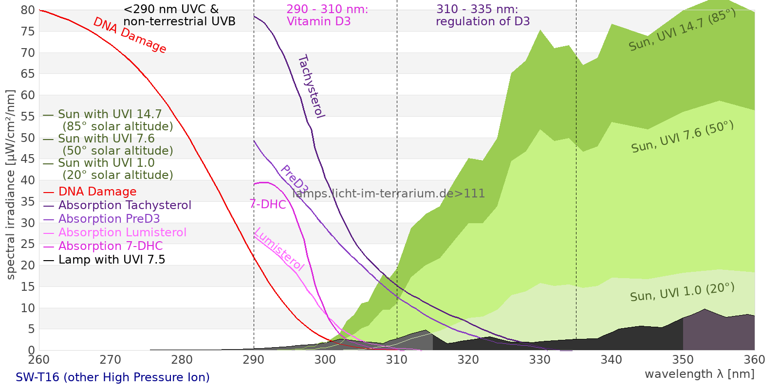 This process prevents any overdose of vitamin D3 from UV radiation with a spectrum similar to sunlight. As a comparison the solar spectra at 20°(id:14) and at 85°(id:21) solar angle are shown.