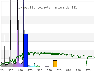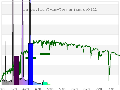Whereas a spectrometer measures the intensity in every tiny wavelength interval resulting in thousands of individual intensities, the human eye only measures three intensities detected by the three cones. The same is true for the reptile eye with usually three or four photoreceptors. Effectively the detailled spectrum displayed above reduces to a much compacter bar graph displayed below. The photoreceptor sensitivites from these L-Cone, M-Cone, S-Cone, and U-Cone are used, they are chosen as an average of measured reptile photoreceptor sensitivity curves. The bar graph also shows as reference the intensity seen by the three or four photoreceptors for average sunlight (ASTM spectrum).