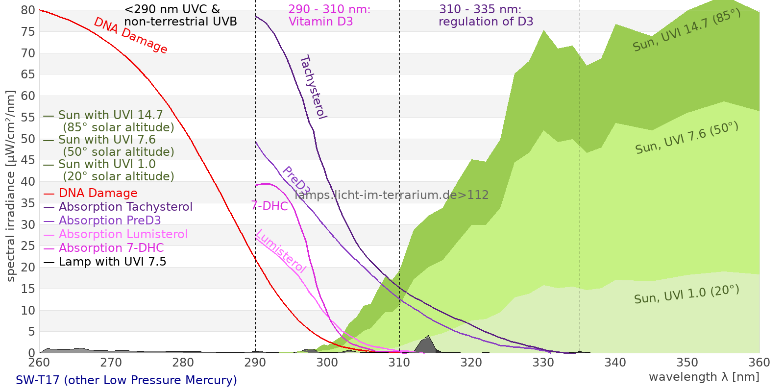 This process prevents any overdose of vitamin D3 from UV radiation with a spectrum similar to sunlight. As a comparison the solar spectra at 20°(id:14) and at 85°(id:21) solar angle are shown.