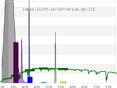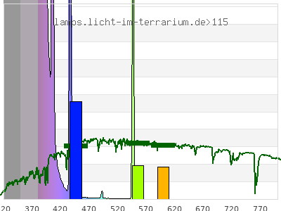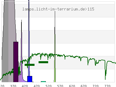 Whereas a spectrometer measures the intensity in every tiny wavelength interval resulting in thousands of individual intensities, the human eye only measures three intensities detected by the three cones. The same is true for the reptile eye with usually three or four photoreceptors. Effectively the detailled spectrum displayed above reduces to a much compacter bar graph displayed below. The photoreceptor sensitivites from these L-Cone, M-Cone, S-Cone, and U-Cone are used, they are chosen as an average of measured reptile photoreceptor sensitivity curves. The bar graph also shows as reference the intensity seen by the three or four photoreceptors for average sunlight (ASTM spectrum).