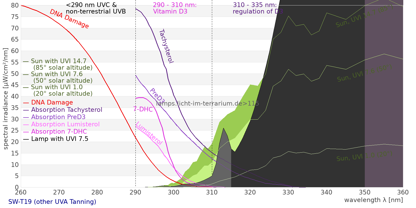 This process prevents any overdose of vitamin D3 from UV radiation with a spectrum similar to sunlight. As a comparison the solar spectra at 20°(id:14) and at 85°(id:21) solar angle are shown.