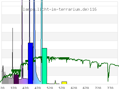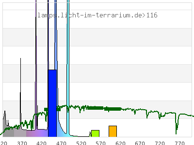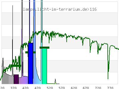 Whereas a spectrometer measures the intensity in every tiny wavelength interval resulting in thousands of individual intensities, the human eye only measures three intensities detected by the three cones. The same is true for the reptile eye with usually three or four photoreceptors. Effectively the detailled spectrum displayed above reduces to a much compacter bar graph displayed below. The photoreceptor sensitivites from these L-Cone, M-Cone, S-Cone, and U-Cone are used, they are chosen as an average of measured reptile photoreceptor sensitivity curves. The bar graph also shows as reference the intensity seen by the three or four photoreceptors for average sunlight (ASTM spectrum).