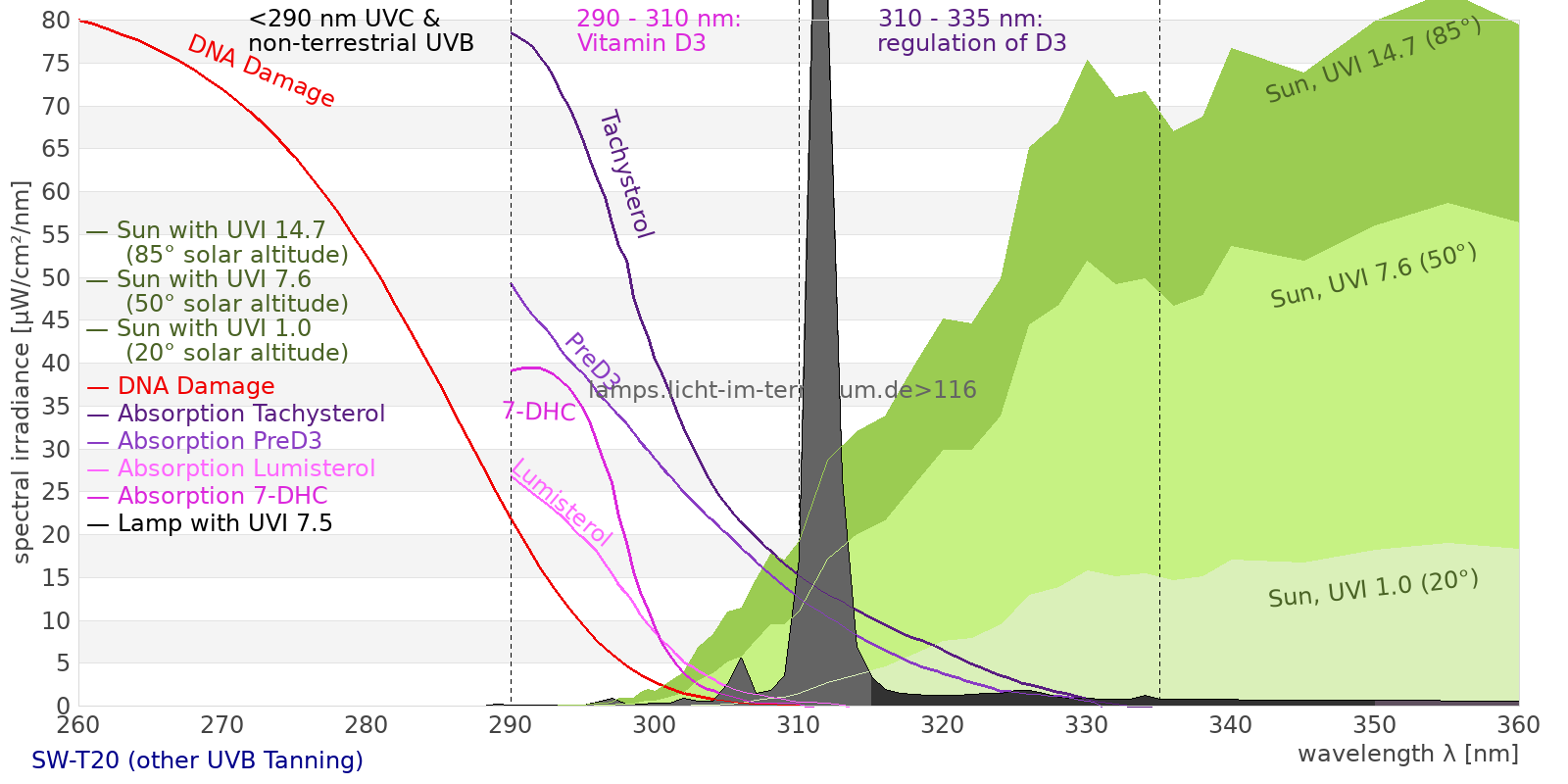This process prevents any overdose of vitamin D3 from UV radiation with a spectrum similar to sunlight. As a comparison the solar spectra at 20°(id:14) and at 85°(id:21) solar angle are shown.