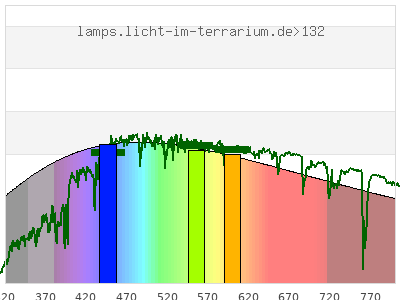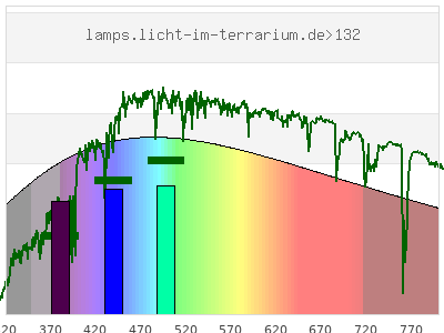Whereas a spectrometer measures the intensity in every tiny wavelength interval resulting in thousands of individual intensities, the human eye only measures three intensities detected by the three cones. The same is true for the reptile eye with usually three or four photoreceptors. Effectively the detailled spectrum displayed above reduces to a much compacter bar graph displayed below. The photoreceptor sensitivites from these L-Cone, M-Cone, S-Cone, and U-Cone are used, they are chosen as an average of measured reptile photoreceptor sensitivity curves. The bar graph also shows as reference the intensity seen by the three or four photoreceptors for average sunlight (ASTM spectrum).