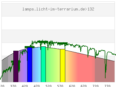 total ( 0 nm - 0 nm) 196000 µW/cm² = 1960 W/m² UVC ( 0 nm - 280 nm) 5180 µW/cm² = 51.8 W/m² non-terrestrial ( 0 nm - 290 nm) 6360 µW/cm² = 63.6 W/m² total2 ( 250 nm - 880 nm) 128000 µW/cm² = 1280 W/m² UVB (EU) ( 280 nm - 315 nm) 4710 µW/cm² = 47.1 W/m² UVB (US) ( 280 nm - 320 nm) 5520 µW/cm² = 55.2 W/m² UVA+B ( 280 nm - 380 nm) 17500 µW/cm² = 175 W/m² Solar UVB ( 290 nm - 315 nm) 3540 µW/cm² = 35.4 W/m² UVA D3 regulating ( 315 nm - 335 nm) 3420 µW/cm² = 34.2 W/m² UVA (EU) ( 315 nm - 380 nm) 12800 µW/cm² = 128 W/m² UVA2 (medical definition) ( 320 nm - 340 nm) 3550 µW/cm² = 35.5 W/m² UVA (US) ( 320 nm - 380 nm) 12000 µW/cm² = 120 W/m² UVA1 (variant) ( 335 nm - 380 nm) 9340 µW/cm² = 93.4 W/m² UVA1 (medical) ( 340 nm - 400 nm) 13100 µW/cm² = 131 W/m² vis. UVA ( 350 nm - 380 nm) 6460 µW/cm² = 64.6 W/m² VIS Rep3 ( 350 nm - 600 nm) 62700 µW/cm² = 627 W/m² VIS Rep4 ( 350 nm - 700 nm) 84700 µW/cm² = 847 W/m² purple ( 380 nm - 420 nm) 9680 µW/cm² = 96.8 W/m² VIS ( 380 nm - 780 nm) 92900 µW/cm² = 929 W/m² VIS2 ( 400 nm - 680 nm) 69400 µW/cm² = 694 W/m² PAR ( 400 nm - 700 nm) 73500 µW/cm² = 735 W/m² tmp ( 400 nm - 1100 nm) 126000 µW/cm² = 1260 W/m² blue ( 420 nm - 490 nm) 18400 µW/cm² = 184 W/m² green ( 490 nm - 575 nm) 22100 µW/cm² = 221 W/m² yellow ( 575 nm - 585 nm) 2470 µW/cm² = 24.7 W/m² orange ( 585 nm - 650 nm) 15200 µW/cm² = 152 W/m² red ( 650 nm - 780 nm) 25100 µW/cm² = 251 W/m² IR2 ( 655 nm - 685 nm) 6360 µW/cm² = 63.6 W/m² IRA ( 700 nm - 1400 nm) 69600 µW/cm² = 696 W/m² IRB ( 1400 nm - 3000 nm) 21500 µW/cm² = 215 W/m²