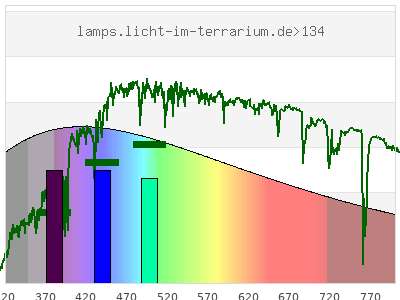 Whereas a spectrometer measures the intensity in every tiny wavelength interval resulting in thousands of individual intensities, the human eye only measures three intensities detected by the three cones. The same is true for the reptile eye with usually three or four photoreceptors. Effectively the detailled spectrum displayed above reduces to a much compacter bar graph displayed below. The photoreceptor sensitivites from these L-Cone, M-Cone, S-Cone, and U-Cone are used, they are chosen as an average of measured reptile photoreceptor sensitivity curves. The bar graph also shows as reference the intensity seen by the three or four photoreceptors for average sunlight (ASTM spectrum).