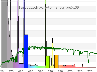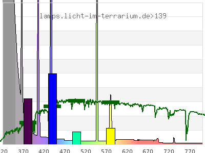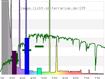total ( 0 nm - 0 nm) 1150 µW/cm² = 11.5 W/m² UVC ( 0 nm - 280 nm) 1.99 µW/cm² = 0.0199 W/m² non-terrestrial ( 0 nm - 290 nm) 31.9 µW/cm² = 0.319 W/m² total2 ( 250 nm - 880 nm) 1150 µW/cm² = 11.5 W/m² UVB (EU) ( 280 nm - 315 nm) 408 µW/cm² = 4.08 W/m² UVB (US) ( 280 nm - 320 nm) 495 µW/cm² = 4.95 W/m² UVA+B ( 280 nm - 380 nm) 881 µW/cm² = 8.81 W/m² Solar UVB ( 290 nm - 315 nm) 378 µW/cm² = 3.78 W/m² UVA D3 regulating ( 315 nm - 335 nm) 302 µW/cm² = 3.02 W/m² UVA (EU) ( 315 nm - 380 nm) 473 µW/cm² = 4.73 W/m² UVA2 (medical definition) ( 320 nm - 340 nm) 258 µW/cm² = 2.58 W/m² UVA (US) ( 320 nm - 380 nm) 386 µW/cm² = 3.86 W/m² UVA1 (variant) ( 335 nm - 380 nm) 171 µW/cm² = 1.71 W/m² UVA1 (medical) ( 340 nm - 400 nm) 136 µW/cm² = 1.36 W/m² vis. UVA ( 350 nm - 380 nm) 69.9 µW/cm² = 0.699 W/m² VIS Rep3 ( 350 nm - 600 nm) 316 µW/cm² = 3.16 W/m² VIS Rep4 ( 350 nm - 700 nm) 332 µW/cm² = 3.32 W/m² purple ( 380 nm - 420 nm) 57 µW/cm² = 0.57 W/m² VIS ( 380 nm - 780 nm) 267 µW/cm² = 2.67 W/m² VIS2 ( 400 nm - 680 nm) 251 µW/cm² = 2.51 W/m² PAR ( 400 nm - 700 nm) 254 µW/cm² = 2.54 W/m² tmp ( 400 nm - 1100 nm) 260 µW/cm² = 2.6 W/m² blue ( 420 nm - 490 nm) 119 µW/cm² = 1.19 W/m² green ( 490 nm - 575 nm) 58.6 µW/cm² = 0.586 W/m² yellow ( 575 nm - 585 nm) 9.64 µW/cm² = 0.0964 W/m² orange ( 585 nm - 650 nm) 10.8 µW/cm² = 0.108 W/m² red ( 650 nm - 780 nm) 12.7 µW/cm² = 0.127 W/m² IR2 ( 655 nm - 685 nm) 4.79 µW/cm² = 0.0479 W/m² IRA ( 700 nm - 1400 nm) 6.3 µW/cm² = 0.063 W/m² IRB ( 1400 nm - 3000 nm) 0 µW/cm² = 0 W/m²