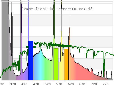 total ( 0 nm - 0 nm) 2100 µW/cm² = 21 W/m² UVC ( 0 nm - 280 nm) 4.29 µW/cm² = 0.0429 W/m² non-terrestrial ( 0 nm - 290 nm) 5.76 µW/cm² = 0.0576 W/m² total2 ( 250 nm - 880 nm) 2100 µW/cm² = 21 W/m² UVB (EU) ( 280 nm - 315 nm) 87.2 µW/cm² = 0.872 W/m² UVB (US) ( 280 nm - 320 nm) 149 µW/cm² = 1.49 W/m² UVA+B ( 280 nm - 380 nm) 736 µW/cm² = 7.36 W/m² Solar UVB ( 290 nm - 315 nm) 85.8 µW/cm² = 0.858 W/m² UVA D3 regulating ( 315 nm - 335 nm) 281 µW/cm² = 2.81 W/m² UVA (EU) ( 315 nm - 380 nm) 649 µW/cm² = 6.49 W/m² UVA2 (medical definition) ( 320 nm - 340 nm) 304 µW/cm² = 3.04 W/m² UVA (US) ( 320 nm - 380 nm) 587 µW/cm² = 5.87 W/m² UVA1 (variant) ( 335 nm - 380 nm) 368 µW/cm² = 3.68 W/m² UVA1 (medical) ( 340 nm - 400 nm) 297 µW/cm² = 2.97 W/m² vis. UVA ( 350 nm - 380 nm) 147 µW/cm² = 1.47 W/m² VIS Rep3 ( 350 nm - 600 nm) 1130 µW/cm² = 11.3 W/m² VIS Rep4 ( 350 nm - 700 nm) 1400 µW/cm² = 14 W/m² purple ( 380 nm - 420 nm) 108 µW/cm² = 1.08 W/m² VIS ( 380 nm - 780 nm) 1320 µW/cm² = 13.2 W/m² VIS2 ( 400 nm - 680 nm) 1210 µW/cm² = 12.1 W/m² PAR ( 400 nm - 700 nm) 1240 µW/cm² = 12.4 W/m² tmp ( 400 nm - 1100 nm) 1340 µW/cm² = 13.4 W/m² blue ( 420 nm - 490 nm) 381 µW/cm² = 3.81 W/m² green ( 490 nm - 575 nm) 377 µW/cm² = 3.77 W/m² yellow ( 575 nm - 585 nm) 67.9 µW/cm² = 0.679 W/m² orange ( 585 nm - 650 nm) 225 µW/cm² = 2.25 W/m² red ( 650 nm - 780 nm) 159 µW/cm² = 1.59 W/m² IR2 ( 655 nm - 685 nm) 58.2 µW/cm² = 0.582 W/m² IRA ( 700 nm - 1400 nm) 104 µW/cm² = 1.04 W/m² IRB ( 1400 nm - 3000 nm) 0 µW/cm² = 0 W/m²