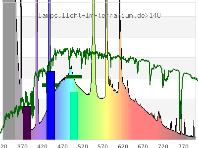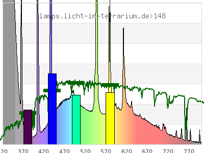 Whereas a spectrometer measures the intensity in every tiny wavelength interval resulting in thousands of individual intensities, the human eye only measures three intensities detected by the three cones. The same is true for the reptile eye with usually three or four photoreceptors. Effectively the detailled spectrum displayed above reduces to a much compacter bar graph displayed below. The photoreceptor sensitivites from these L-Cone, M-Cone, S-Cone, and U-Cone are used, they are chosen as an average of measured reptile photoreceptor sensitivity curves. The bar graph also shows as reference the intensity seen by the three or four photoreceptors for average sunlight (ASTM spectrum).