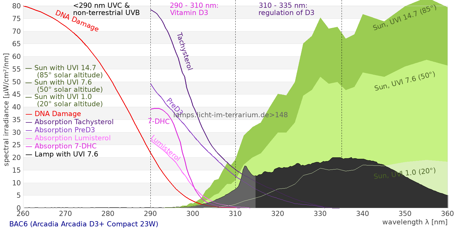 Erythema 6.95 UV-Index Pyrimidine dimerization of DNA 53.9 µW/cm² Photoceratitis 9.79 µW/cm² Photoconjunctivitis 3.98 µW/cm² DNA Damage 4.96 Vitamin D3 22 µW/cm² Photosynthesis 864 µW/cm² Luminosity 3490 lx Human L-Cone 517 µW/cm² Human M-Cone 444 µW/cm² Human S-Cone 323 µW/cm² CIE X 473 µW/cm² CIE Y 485 µW/cm² CIE Z 595 µW/cm² PAR PPFD 60.1 µmol/m²/s Extinction preD3 196 e-3*m²/mol Extinction Tachysterol 647 e-3*m²/mol Exctincition PreD3 115000 m²/mol Extinction Lumisterol 55.9 m²/mol Exctincition Tachysterol 941000 m²/mol Extinction 7DHC 60.7 m²/mol L-Cone 430 µW/cm² M-Cone 407 µW/cm² S-Cone 583 µW/cm² U-Cone 286 µW/cm² UVR - ICNIRP 2004 7.78 Rel Biol Eff Melatonin Supression 431 µW/cm² Blue Light Hazard 368 µW/cm² (105 µW/cm² per 1000 lx) CIE 174:2006 PreVit D3 23.9 µW/cm² Lumen Reptil 3830 "pseudo-lx" Vitamin D3 Degradation 30.4 µW/cm² Actinic UV 7.74 µW/cm² (22.2 mW/klm) Exctincition Lumisterol 68400 m²/mol Exctincition 7DHC 67500 m²/mol Exctincition Toxisterols 31500 m²/mol