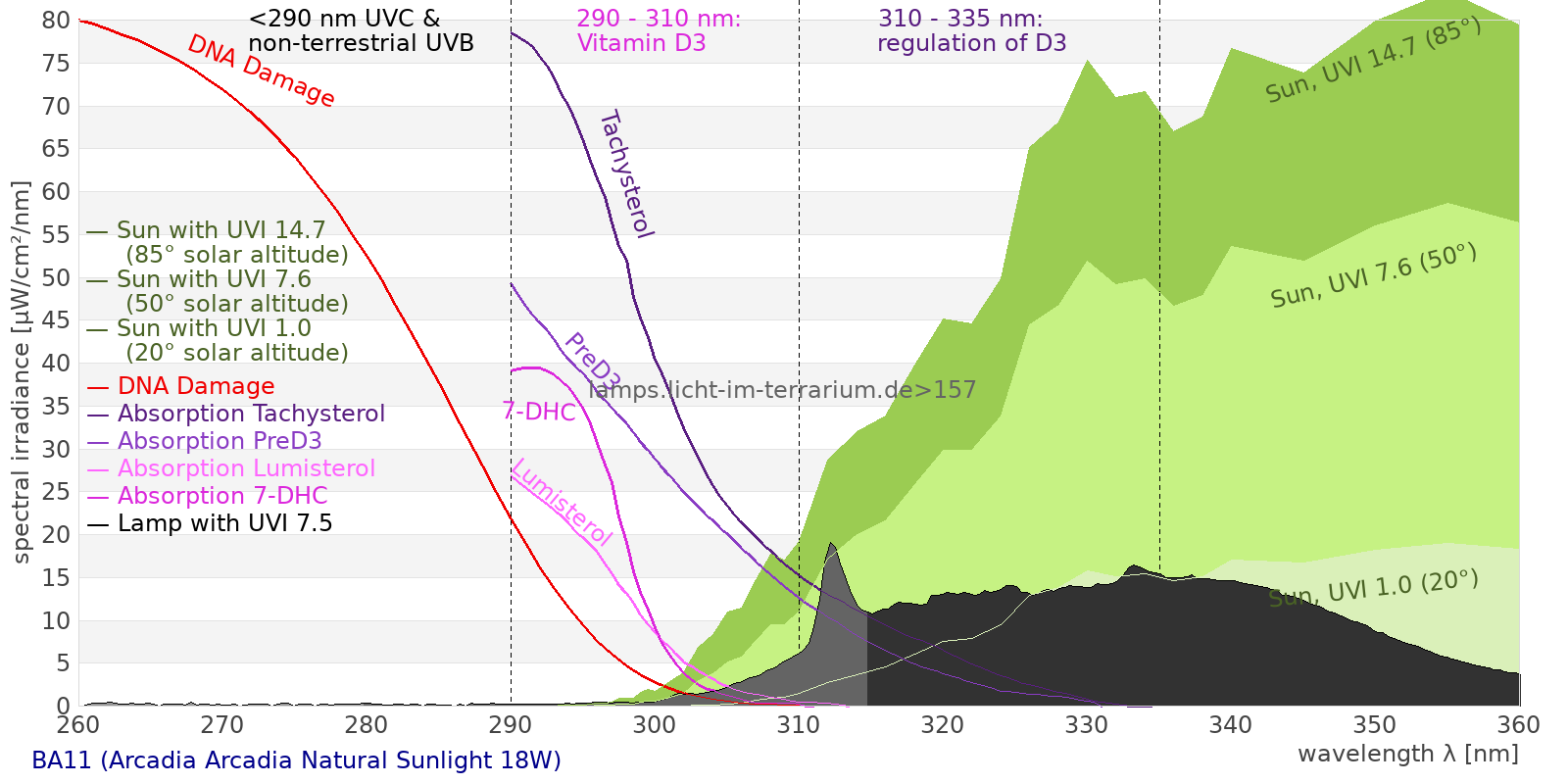 Erythema 1.14 UV-Index Pyrimidine dimerization of DNA 7.64 µW/cm² Photoceratitis 1.58 µW/cm² Photoconjunctivitis 0.817 µW/cm² DNA Damage 0.983 Vitamin D3 3.28 µW/cm² Photosynthesis 483 µW/cm² Luminosity 2210 lx Human L-Cone 331 µW/cm² Human M-Cone 274 µW/cm² Human S-Cone 167 µW/cm² CIE X 302 µW/cm² CIE Y 307 µW/cm² CIE Z 312 µW/cm² PAR PPFD 33 µmol/m²/s Extinction preD3 30.7 e-3*m²/mol Extinction Tachysterol 98.1 e-3*m²/mol Exctincition PreD3 18900 m²/mol Extinction Lumisterol 10.4 m²/mol Exctincition Tachysterol 139000 m²/mol Extinction 7DHC 11.6 m²/mol L-Cone 276 µW/cm² M-Cone 271 µW/cm² S-Cone 284 µW/cm² U-Cone 101 µW/cm² UVR - ICNIRP 2004 1.39 Rel Biol Eff Melatonin Supression 241 µW/cm² Blue Light Hazard 189 µW/cm² (85.6 µW/cm² per 1000 lx) CIE 174:2006 PreVit D3 3.5 µW/cm² Lumen Reptil 2200 "pseudo-lx" Vitamin D3 Degradation 4.4 µW/cm² Actinic UV 1.39 µW/cm² (6.26 mW/klm) Exctincition Lumisterol 12300 m²/mol Exctincition 7DHC 12700 m²/mol Exctincition Toxisterols 5430 m²/mol