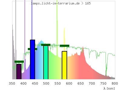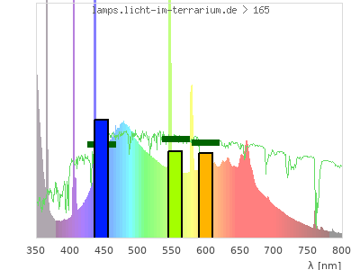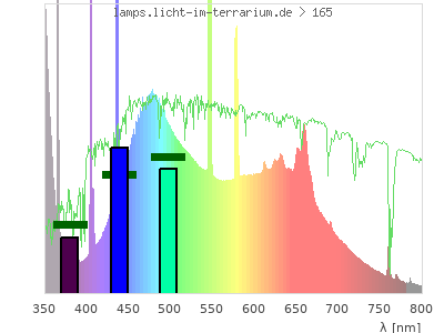 Whereas a spectrometer measures the intensity in every tiny wavelength interval resulting in thousands of individual intensities, the human eye only measures three intensities detected by the three cones. The same is true for the reptile eye with usually three or four photoreceptors. Effectively the detailled spectrum displayed above reduces to a much compacter bar graph displayed below. The photoreceptor sensitivites from these L-Cone, M-Cone, S-Cone, and U-Cone are used, they are chosen as an average of measured reptile photoreceptor sensitivity curves. The bar graph also shows as reference the intensity seen by the three or four photoreceptors for average sunlight (id 1).