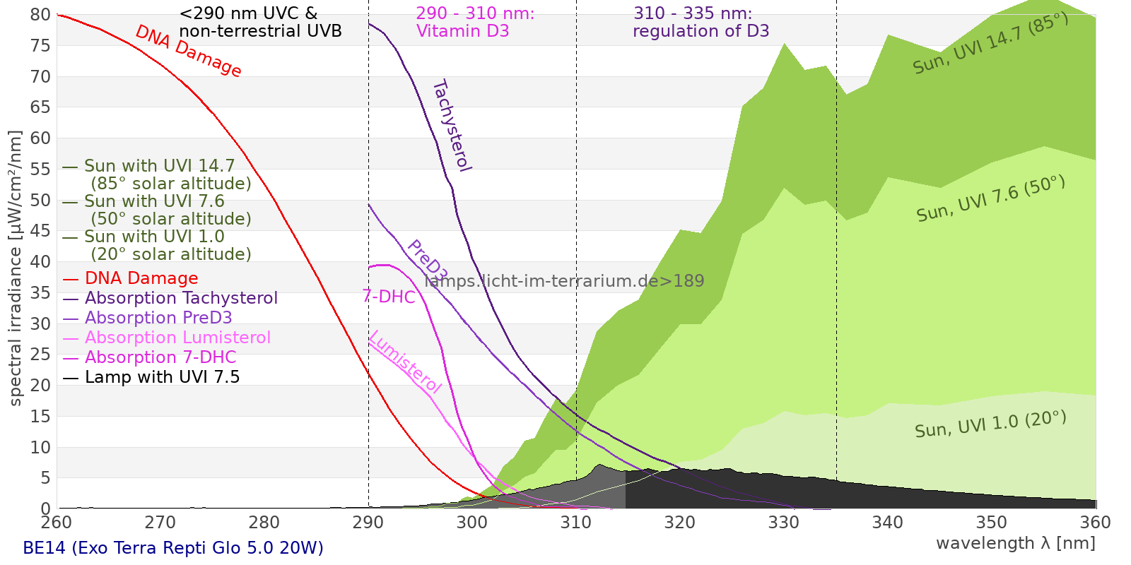 This process prevents any overdose of vitamin D3 from UV radiation with a spectrum similar to sunlight. As a comparison the solar spectra at 20°(id:14) and at 85°(id:21) solar angle are shown.