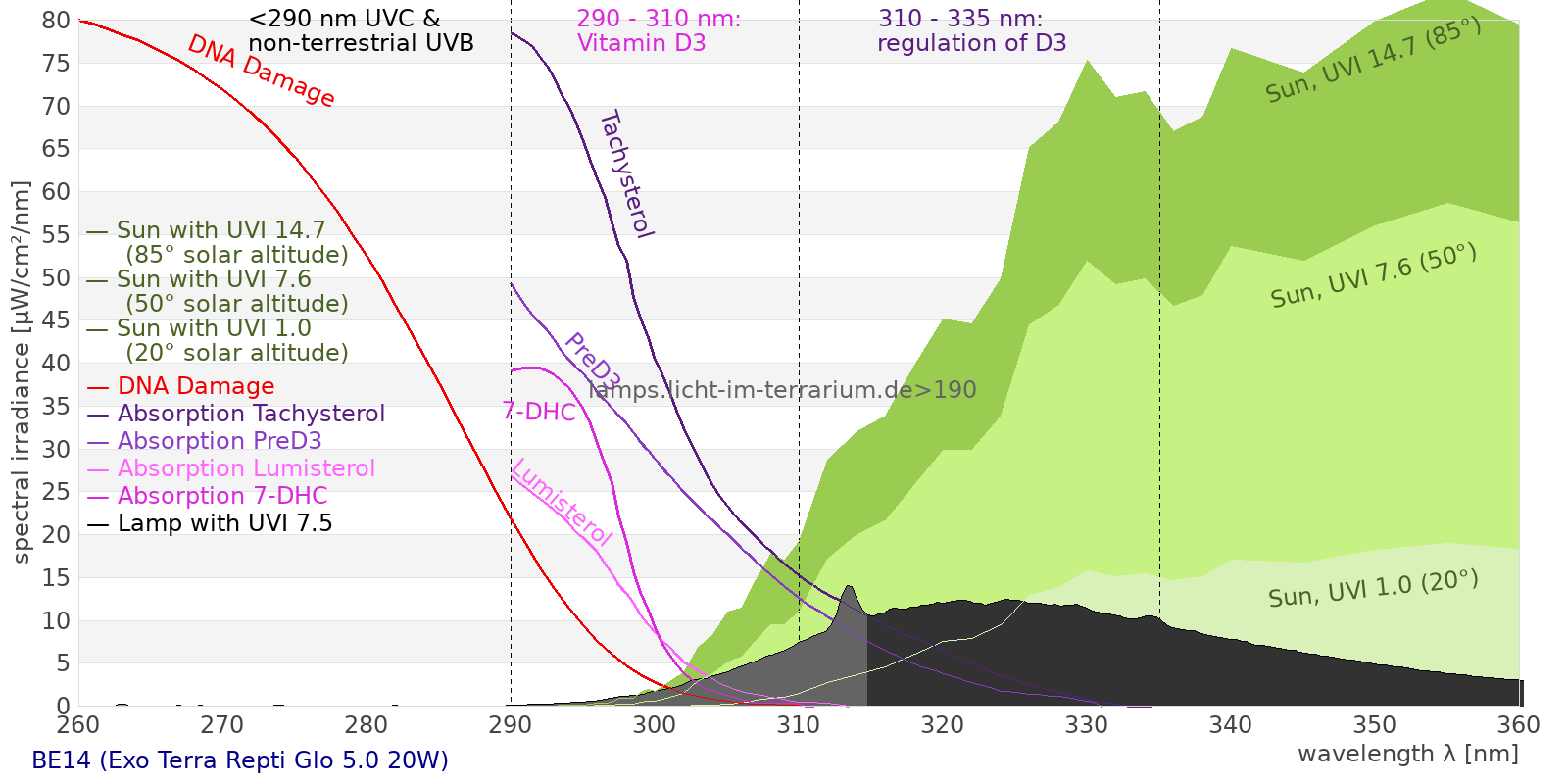 Erythema 1.88 UV-Index Pyrimidine dimerization of DNA 16.1 µW/cm² Photoceratitis 2.82 µW/cm² Photoconjunctivitis 0.201 µW/cm² DNA Damage 0.366 Vitamin D3 7.67 µW/cm² Photosynthesis 424 µW/cm² Luminosity 1360 lx Human L-Cone 192 µW/cm² Human M-Cone 192 µW/cm² Human S-Cone 233 µW/cm² CIE X 182 µW/cm² CIE Y 186 µW/cm² CIE Z 437 µW/cm² PAR PPFD 24.6 µmol/m²/s Extinction preD3 46.7 e-3*m²/mol Extinction Tachysterol 163 e-3*m²/mol Exctincition PreD3 22600 m²/mol Extinction Lumisterol 9.36 m²/mol Exctincition Tachysterol 225000 m²/mol Extinction 7DHC 9.19 m²/mol L-Cone 143 µW/cm² M-Cone 266 µW/cm² S-Cone 392 µW/cm² U-Cone 72 µW/cm² UVR - ICNIRP 2004 1.66 Rel Biol Eff Melatonin Supression 303 µW/cm² Blue Light Hazard 253 µW/cm² (186 µW/cm² per 1000 lx) CIE 174:2006 PreVit D3 8.47 µW/cm² Lumen Reptil 1900 "pseudo-lx" Vitamin D3 Degradation 7.84 µW/cm² Actinic UV 1.64 µW/cm² (12.1 mW/klm) Exctincition Lumisterol 12500 m²/mol Exctincition 7DHC 11500 m²/mol Exctincition Toxisterols 4190 m²/mol