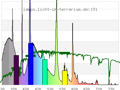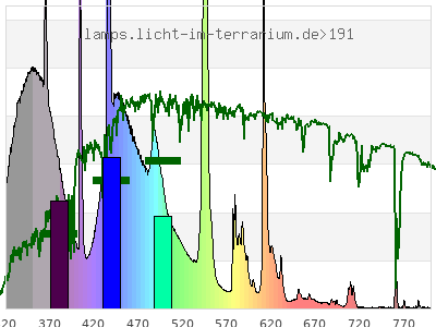 total ( 0 nm - 0 nm) 811 µW/cm² = 8.11 W/m² UVC ( 0 nm - 280 nm) 2.32 µW/cm² = 0.0232 W/m² non-terrestrial ( 0 nm - 290 nm) 2.96 µW/cm² = 0.0296 W/m² total2 ( 250 nm - 880 nm) 811 µW/cm² = 8.11 W/m² UVB (EU) ( 280 nm - 315 nm) 16.6 µW/cm² = 0.166 W/m² UVB (US) ( 280 nm - 320 nm) 26.5 µW/cm² = 0.265 W/m² UVA+B ( 280 nm - 380 nm) 248 µW/cm² = 2.48 W/m² Solar UVB ( 290 nm - 315 nm) 16 µW/cm² = 0.16 W/m² UVA D3 regulating ( 315 nm - 335 nm) 54.3 µW/cm² = 0.543 W/m² UVA (EU) ( 315 nm - 380 nm) 231 µW/cm² = 2.31 W/m² UVA2 (medical definition) ( 320 nm - 340 nm) 64.1 µW/cm² = 0.641 W/m² UVA (US) ( 320 nm - 380 nm) 221 µW/cm² = 2.21 W/m² UVA1 (variant) ( 335 nm - 380 nm) 177 µW/cm² = 1.77 W/m² UVA1 (medical) ( 340 nm - 400 nm) 192 µW/cm² = 1.92 W/m² vis. UVA ( 350 nm - 380 nm) 116 µW/cm² = 1.16 W/m² VIS Rep3 ( 350 nm - 600 nm) 612 µW/cm² = 6.12 W/m² VIS Rep4 ( 350 nm - 700 nm) 662 µW/cm² = 6.62 W/m² purple ( 380 nm - 420 nm) 70.3 µW/cm² = 0.703 W/m² VIS ( 380 nm - 780 nm) 553 µW/cm² = 5.53 W/m² VIS2 ( 400 nm - 680 nm) 509 µW/cm² = 5.09 W/m² PAR ( 400 nm - 700 nm) 511 µW/cm² = 5.11 W/m² tmp ( 400 nm - 1100 nm) 526 µW/cm² = 5.26 W/m² blue ( 420 nm - 490 nm) 254 µW/cm² = 2.54 W/m² green ( 490 nm - 575 nm) 146 µW/cm² = 1.46 W/m² yellow ( 575 nm - 585 nm) 13.5 µW/cm² = 0.135 W/m² orange ( 585 nm - 650 nm) 55.2 µW/cm² = 0.552 W/m² red ( 650 nm - 780 nm) 14.5 µW/cm² = 0.145 W/m² IR2 ( 655 nm - 685 nm) 4.53 µW/cm² = 0.0453 W/m² IRA ( 700 nm - 1400 nm) 15.1 µW/cm² = 0.151 W/m² IRB ( 1400 nm - 3000 nm) 0 µW/cm² = 0 W/m²