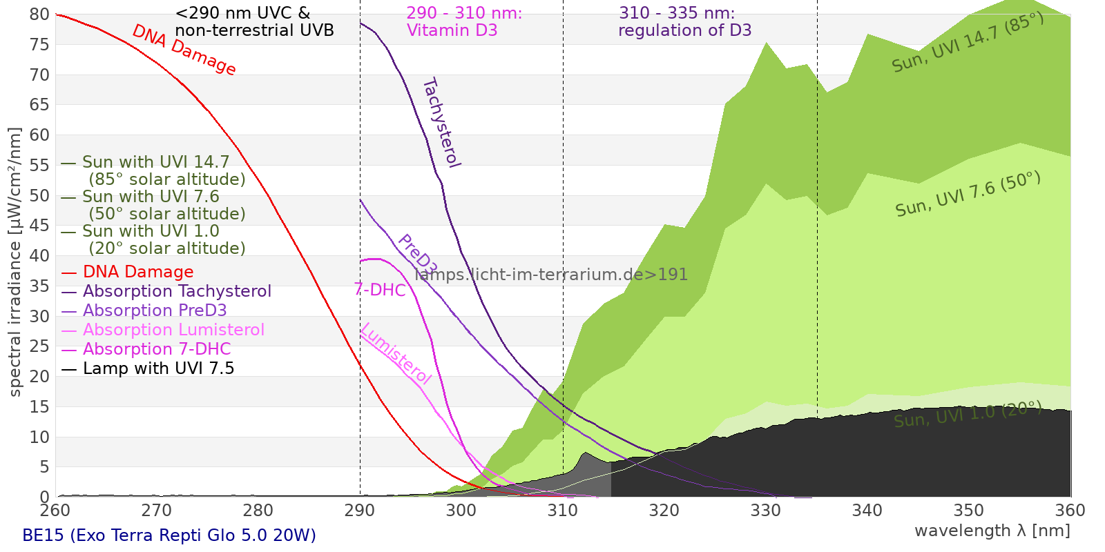 This process prevents any overdose of vitamin D3 from UV radiation with a spectrum similar to sunlight. As a comparison the solar spectra at 20°(id:14) and at 85°(id:21) solar angle are shown.