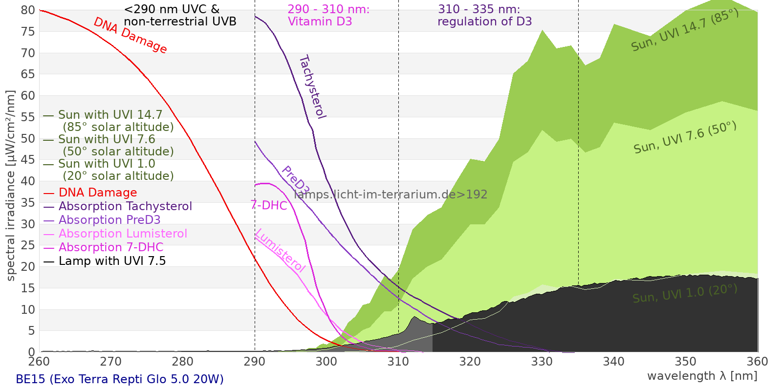 This process prevents any overdose of vitamin D3 from UV radiation with a spectrum similar to sunlight. As a comparison the solar spectra at 20°(id:14) and at 85°(id:21) solar angle are shown.