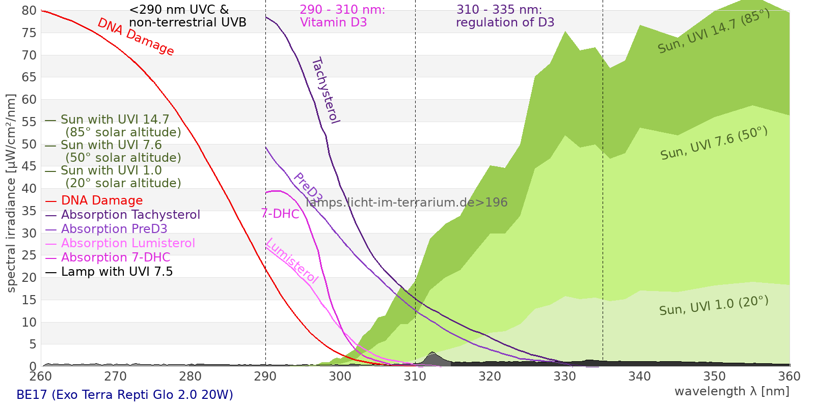 This process prevents any overdose of vitamin D3 from UV radiation with a spectrum similar to sunlight. As a comparison the solar spectra at 20°(id:14) and at 85°(id:21) solar angle are shown.