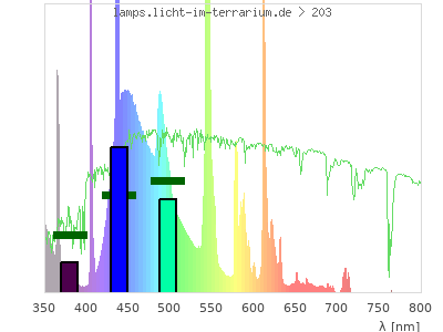 total ( 0 nm - 0 nm) 1060 µW/cm² = 10.6 W/m² UVC ( 0 nm - 280 nm) 0 µW/cm² = 0 W/m² non-terrestrial ( 0 nm - 290 nm) 0.594 µW/cm² = 0.00594 W/m² total2 ( 250 nm - 880 nm) 1060 µW/cm² = 10.6 W/m² UVB (EU) ( 280 nm - 315 nm) 75.5 µW/cm² = 0.755 W/m² UVB (US) ( 280 nm - 320 nm) 105 µW/cm² = 1.05 W/m² UVA+B ( 280 nm - 380 nm) 270 µW/cm² = 2.7 W/m² Solar UVB ( 290 nm - 315 nm) 74.9 µW/cm² = 0.749 W/m² UVA D3 regulating ( 315 nm - 335 nm) 110 µW/cm² = 1.1 W/m² UVA (EU) ( 315 nm - 380 nm) 195 µW/cm² = 1.95 W/m² UVA2 (medical definition) ( 320 nm - 340 nm) 98.9 µW/cm² = 0.989 W/m² UVA (US) ( 320 nm - 380 nm) 165 µW/cm² = 1.65 W/m² UVA1 (variant) ( 335 nm - 380 nm) 84.4 µW/cm² = 0.844 W/m² UVA1 (medical) ( 340 nm - 400 nm) 69.9 µW/cm² = 0.699 W/m² vis. UVA ( 350 nm - 380 nm) 41 µW/cm² = 0.41 W/m² VIS Rep3 ( 350 nm - 600 nm) 754 µW/cm² = 7.54 W/m² VIS Rep4 ( 350 nm - 700 nm) 827 µW/cm² = 8.27 W/m² purple ( 380 nm - 420 nm) 43.9 µW/cm² = 0.439 W/m² VIS ( 380 nm - 780 nm) 790 µW/cm² = 7.9 W/m² VIS2 ( 400 nm - 680 nm) 779 µW/cm² = 7.79 W/m² PAR ( 400 nm - 700 nm) 782 µW/cm² = 7.82 W/m² tmp ( 400 nm - 1100 nm) 786 µW/cm² = 7.86 W/m² blue ( 420 nm - 490 nm) 390 µW/cm² = 3.9 W/m² green ( 490 nm - 575 nm) 237 µW/cm² = 2.37 W/m² yellow ( 575 nm - 585 nm) 21.8 µW/cm² = 0.218 W/m² orange ( 585 nm - 650 nm) 84 µW/cm² = 0.84 W/m² red ( 650 nm - 780 nm) 13.7 µW/cm² = 0.137 W/m² IRA ( 700 nm - 1400 nm) 4.26 µW/cm² = 0.0426 W/m² IR2 ( 720 nm - 1100 nm) 0.167 µW/cm² = 0.00167 W/m² IRB ( 1400 nm - 3000 nm) 0 µW/cm² = 0 W/m²