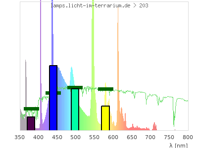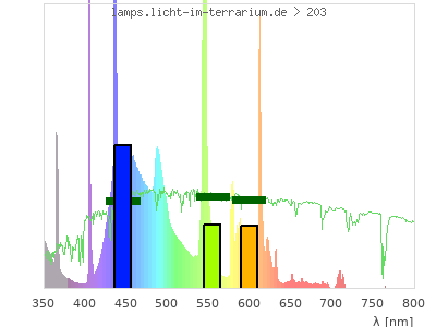 Whereas a spectrometer measures the intensity in every tiny wavelength interval resulting in thousands of individual intensities, the human eye only measures three intensities detected by the three cones. The same is true for the reptile eye with usually three or four photoreceptors. Effectively the detailled spectrum displayed above reduces to a much compacter bar graph displayed below. The photoreceptor sensitivites from these L-Cone, M-Cone, S-Cone, and U-Cone are used, they are chosen as an average of measured reptile photoreceptor sensitivity curves. The bar graph also shows as reference the intensity seen by the three or four photoreceptors for average sunlight (id 1).
