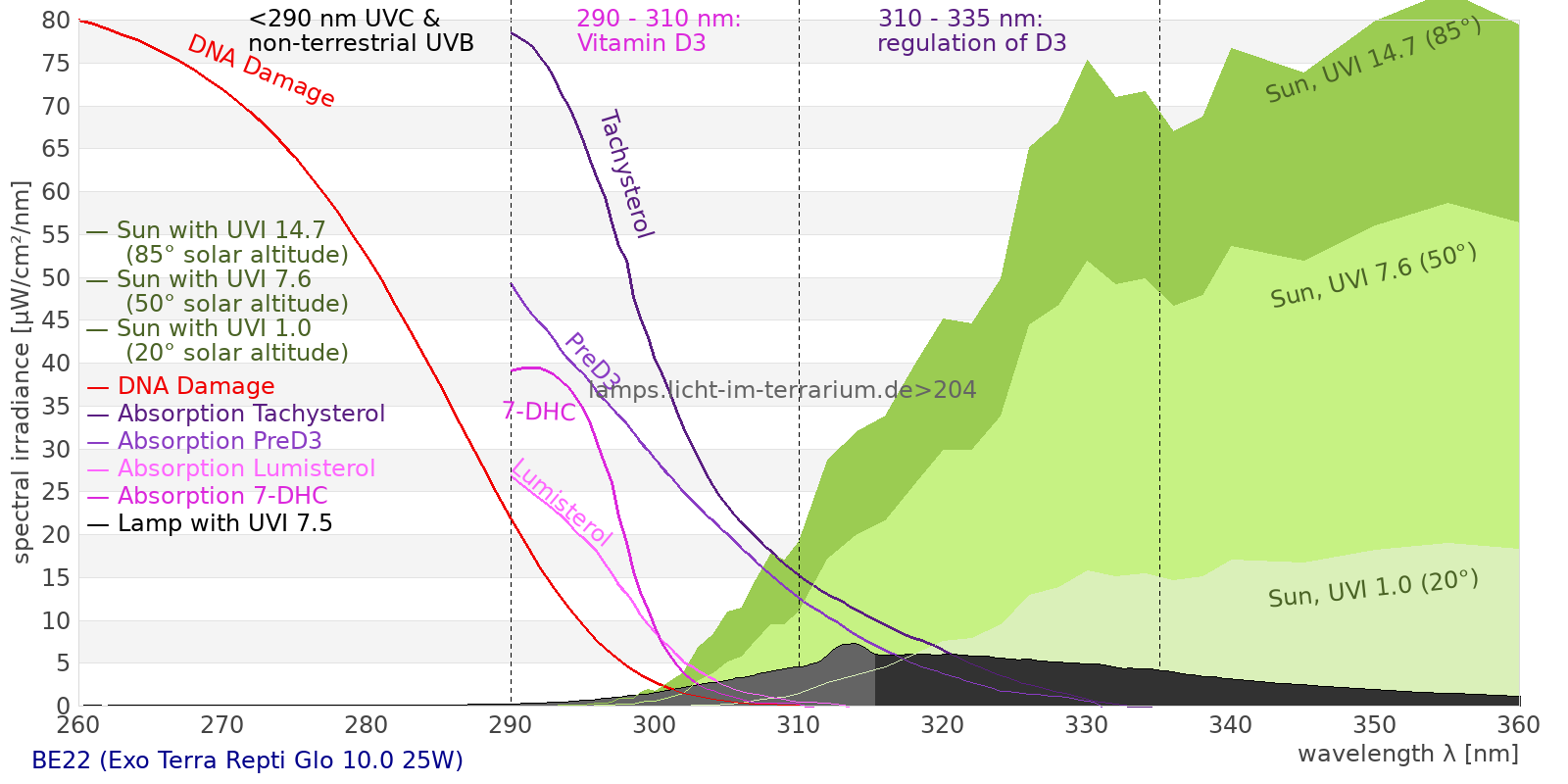 Erythema 7.89 UV-Index Pyrimidine dimerization of DNA 44.1 µW/cm² Photoceratitis 11.2 µW/cm² Photoconjunctivitis 2.87 µW/cm² DNA Damage 4.05 Vitamin D3 26.3 µW/cm² Photosynthesis 592 µW/cm² Luminosity 1940 lx Human L-Cone 275 µW/cm² Human M-Cone 270 µW/cm² Human S-Cone 321 µW/cm² CIE X 262 µW/cm² CIE Y 265 µW/cm² CIE Z 599 µW/cm² PAR PPFD 35 µmol/m²/s Extinction preD3 157 e-3*m²/mol Extinction Tachysterol 518 e-3*m²/mol Exctincition PreD3 88600 m²/mol Extinction Lumisterol 59.8 m²/mol Exctincition Tachysterol 685000 m²/mol Extinction 7DHC 67.8 m²/mol L-Cone 208 µW/cm² M-Cone 354 µW/cm² S-Cone 550 µW/cm² U-Cone 113 µW/cm² UVR - ICNIRP 2004 9.03 Rel Biol Eff Melatonin Supression 411 µW/cm² Blue Light Hazard 350 µW/cm² (181 µW/cm² per 1000 lx) CIE 174:2006 PreVit D3 28.7 µW/cm² Lumen Reptil 2660 "pseudo-lx" Vitamin D3 Degradation 22.1 µW/cm² Actinic UV 8.94 µW/cm² (46.2 mW/klm) Exctincition Lumisterol 71700 m²/mol Exctincition 7DHC 78000 m²/mol Exctincition Toxisterols 19900 m²/mol