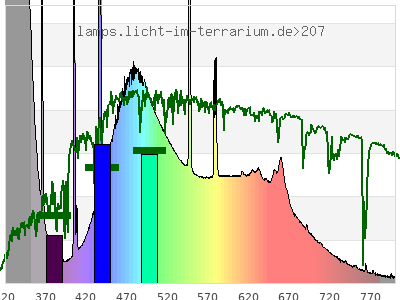 Whereas a spectrometer measures the intensity in every tiny wavelength interval resulting in thousands of individual intensities, the human eye only measures three intensities detected by the three cones. The same is true for the reptile eye with usually three or four photoreceptors. Effectively the detailled spectrum displayed above reduces to a much compacter bar graph displayed below. The photoreceptor sensitivites from these L-Cone, M-Cone, S-Cone, and U-Cone are used, they are chosen as an average of measured reptile photoreceptor sensitivity curves. The bar graph also shows as reference the intensity seen by the three or four photoreceptors for average sunlight (ASTM spectrum).