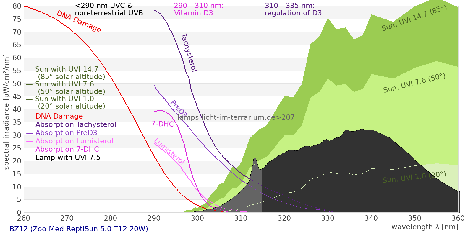 This process prevents any overdose of vitamin D3 from UV radiation with a spectrum similar to sunlight. As a comparison the solar spectra at 20°(id:14) and at 85°(id:21) solar angle are shown.