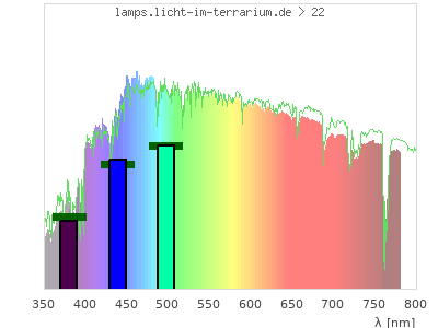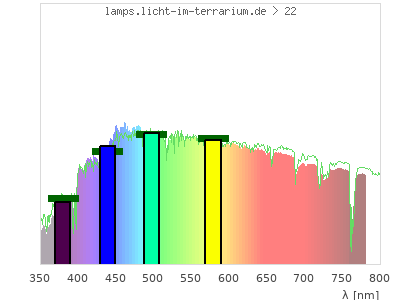 Whereas a spectrometer measures the intensity in every tiny wavelength interval resulting in thousands of individual intensities, the human eye only measures three intensities detected by the three cones. The same is true for the reptile eye with usually three or four photoreceptors. Effectively the detailled spectrum displayed above reduces to a much compacter bar graph displayed below. The photoreceptor sensitivites from these L-Cone, M-Cone, S-Cone, and U-Cone are used, they are chosen as an average of measured reptile photoreceptor sensitivity curves. The bar graph also shows as reference the intensity seen by the three or four photoreceptors for average sunlight (id 1).