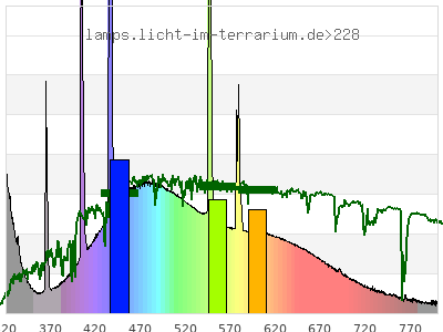 total ( 0 nm - 0 nm) 692 µW/cm² = 6.92 W/m² UVC ( 0 nm - 280 nm) 1.73 µW/cm² = 0.0173 W/m² non-terrestrial ( 0 nm - 290 nm) 3.5 µW/cm² = 0.035 W/m² total2 ( 250 nm - 880 nm) 692 µW/cm² = 6.92 W/m² UVB (EU) ( 280 nm - 315 nm) 58.8 µW/cm² = 0.588 W/m² UVB (US) ( 280 nm - 320 nm) 71.4 µW/cm² = 0.714 W/m² UVA+B ( 280 nm - 380 nm) 122 µW/cm² = 1.22 W/m² Solar UVB ( 290 nm - 315 nm) 57 µW/cm² = 0.57 W/m² UVA D3 regulating ( 315 nm - 335 nm) 35.1 µW/cm² = 0.351 W/m² UVA (EU) ( 315 nm - 380 nm) 63.2 µW/cm² = 0.632 W/m² UVA2 (medical definition) ( 320 nm - 340 nm) 26.4 µW/cm² = 0.264 W/m² UVA (US) ( 320 nm - 380 nm) 50.6 µW/cm² = 0.506 W/m² UVA1 (variant) ( 335 nm - 380 nm) 28.1 µW/cm² = 0.281 W/m² UVA1 (medical) ( 340 nm - 400 nm) 36.8 µW/cm² = 0.368 W/m² vis. UVA ( 350 nm - 380 nm) 19.3 µW/cm² = 0.193 W/m² VIS Rep3 ( 350 nm - 600 nm) 452 µW/cm² = 4.52 W/m² VIS Rep4 ( 350 nm - 700 nm) 552 µW/cm² = 5.52 W/m² purple ( 380 nm - 420 nm) 51.5 µW/cm² = 0.515 W/m² VIS ( 380 nm - 780 nm) 560 µW/cm² = 5.6 W/m² VIS2 ( 400 nm - 680 nm) 506 µW/cm² = 5.06 W/m² PAR ( 400 nm - 700 nm) 520 µW/cm² = 5.2 W/m² tmp ( 400 nm - 1100 nm) 556 µW/cm² = 5.56 W/m² blue ( 420 nm - 490 nm) 170 µW/cm² = 1.7 W/m² green ( 490 nm - 575 nm) 170 µW/cm² = 1.7 W/m² yellow ( 575 nm - 585 nm) 22 µW/cm² = 0.22 W/m² orange ( 585 nm - 650 nm) 78.6 µW/cm² = 0.786 W/m² red ( 650 nm - 780 nm) 68.2 µW/cm² = 0.682 W/m² IR2 ( 655 nm - 685 nm) 25.7 µW/cm² = 0.257 W/m² IRA ( 700 nm - 1400 nm) 35.9 µW/cm² = 0.359 W/m² IRB ( 1400 nm - 3000 nm) 0 µW/cm² = 0 W/m²