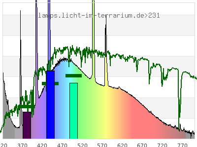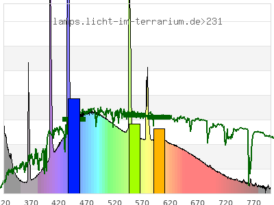 total ( 0 nm - 0 nm) 768 µW/cm² = 7.68 W/m² UVC ( 0 nm - 280 nm) 0.437 µW/cm² = 0.00437 W/m² non-terrestrial ( 0 nm - 290 nm) 1.4 µW/cm² = 0.014 W/m² total2 ( 250 nm - 880 nm) 768 µW/cm² = 7.68 W/m² UVB (EU) ( 280 nm - 315 nm) 49.4 µW/cm² = 0.494 W/m² UVB (US) ( 280 nm - 320 nm) 60.7 µW/cm² = 0.607 W/m² UVA+B ( 280 nm - 380 nm) 111 µW/cm² = 1.11 W/m² Solar UVB ( 290 nm - 315 nm) 48.5 µW/cm² = 0.485 W/m² UVA D3 regulating ( 315 nm - 335 nm) 31.8 µW/cm² = 0.318 W/m² UVA (EU) ( 315 nm - 380 nm) 61.2 µW/cm² = 0.612 W/m² UVA2 (medical definition) ( 320 nm - 340 nm) 24.3 µW/cm² = 0.243 W/m² UVA (US) ( 320 nm - 380 nm) 49.9 µW/cm² = 0.499 W/m² UVA1 (variant) ( 335 nm - 380 nm) 29.4 µW/cm² = 0.294 W/m² UVA1 (medical) ( 340 nm - 400 nm) 40.6 µW/cm² = 0.406 W/m² vis. UVA ( 350 nm - 380 nm) 20.9 µW/cm² = 0.209 W/m² VIS Rep3 ( 350 nm - 600 nm) 515 µW/cm² = 5.15 W/m² VIS Rep4 ( 350 nm - 700 nm) 635 µW/cm² = 6.35 W/m² purple ( 380 nm - 420 nm) 58.6 µW/cm² = 0.586 W/m² VIS ( 380 nm - 780 nm) 647 µW/cm² = 6.47 W/m² VIS2 ( 400 nm - 680 nm) 583 µW/cm² = 5.83 W/m² PAR ( 400 nm - 700 nm) 599 µW/cm² = 5.99 W/m² tmp ( 400 nm - 1100 nm) 642 µW/cm² = 6.42 W/m² blue ( 420 nm - 490 nm) 196 µW/cm² = 1.96 W/m² green ( 490 nm - 575 nm) 191 µW/cm² = 1.91 W/m² yellow ( 575 nm - 585 nm) 24.5 µW/cm² = 0.245 W/m² orange ( 585 nm - 650 nm) 95.1 µW/cm² = 0.951 W/m² red ( 650 nm - 780 nm) 81.6 µW/cm² = 0.816 W/m² IR2 ( 655 nm - 685 nm) 30.7 µW/cm² = 0.307 W/m² IRA ( 700 nm - 1400 nm) 43 µW/cm² = 0.43 W/m² IRB ( 1400 nm - 3000 nm) 0 µW/cm² = 0 W/m²