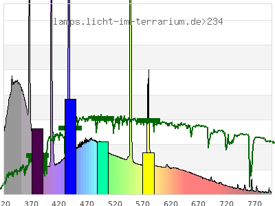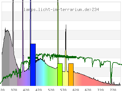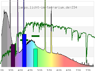 Whereas a spectrometer measures the intensity in every tiny wavelength interval resulting in thousands of individual intensities, the human eye only measures three intensities detected by the three cones. The same is true for the reptile eye with usually three or four photoreceptors. Effectively the detailled spectrum displayed above reduces to a much compacter bar graph displayed below. The photoreceptor sensitivites from these L-Cone, M-Cone, S-Cone, and U-Cone are used, they are chosen as an average of measured reptile photoreceptor sensitivity curves. The bar graph also shows as reference the intensity seen by the three or four photoreceptors for average sunlight (ASTM spectrum).