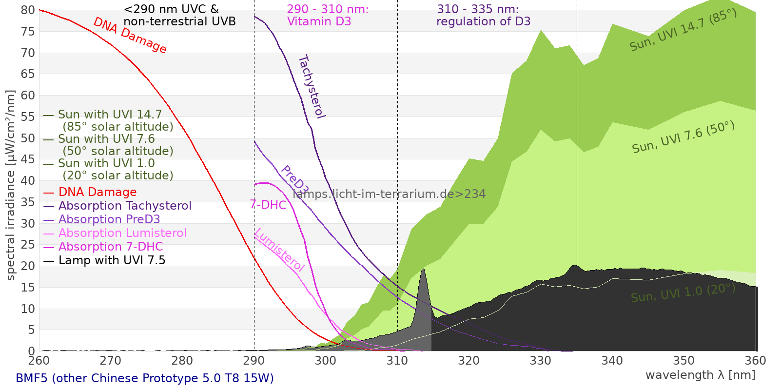 Erythema 0.972 UV-Index Pyrimidine dimerization of DNA 6.21 µW/cm² Photoceratitis 1.34 µW/cm² Photoconjunctivitis 0.419 µW/cm² DNA Damage 0.553 Vitamin D3 3.04 µW/cm² Photosynthesis 219 µW/cm² Luminosity 723 lx Human L-Cone 104 µW/cm² Human M-Cone 97.2 µW/cm² Human S-Cone 103 µW/cm² CIE X 99.2 µW/cm² CIE Y 99.8 µW/cm² CIE Z 187 µW/cm² PAR PPFD 14.2 µmol/m²/s Extinction preD3 22.7 e-3*m²/mol Extinction Tachysterol 75.9 e-3*m²/mol Exctincition PreD3 13500 m²/mol Extinction Lumisterol 7.14 m²/mol Exctincition Tachysterol 113000 m²/mol Extinction 7DHC 8.03 m²/mol L-Cone 83 µW/cm² M-Cone 104 µW/cm² S-Cone 189 µW/cm² U-Cone 130 µW/cm² UVR - ICNIRP 2004 1.07 Rel Biol Eff Melatonin Supression 130 µW/cm² Blue Light Hazard 116 µW/cm² (161 µW/cm² per 1000 lx) CIE 174:2006 PreVit D3 3.27 µW/cm² Lumen Reptil 1040 "pseudo-lx" Vitamin D3 Degradation 3.45 µW/cm² Actinic UV 1.07 µW/cm² (14.7 mW/klm) Exctincition Lumisterol 8670 m²/mol Exctincition 7DHC 9150 m²/mol Exctincition Toxisterols 3690 m²/mol