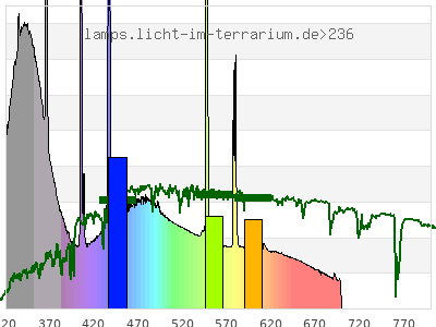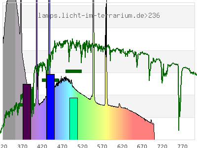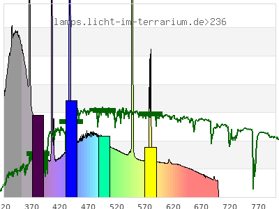 Whereas a spectrometer measures the intensity in every tiny wavelength interval resulting in thousands of individual intensities, the human eye only measures three intensities detected by the three cones. The same is true for the reptile eye with usually three or four photoreceptors. Effectively the detailled spectrum displayed above reduces to a much compacter bar graph displayed below. The photoreceptor sensitivites from these L-Cone, M-Cone, S-Cone, and U-Cone are used, they are chosen as an average of measured reptile photoreceptor sensitivity curves. The bar graph also shows as reference the intensity seen by the three or four photoreceptors for average sunlight (ASTM spectrum).