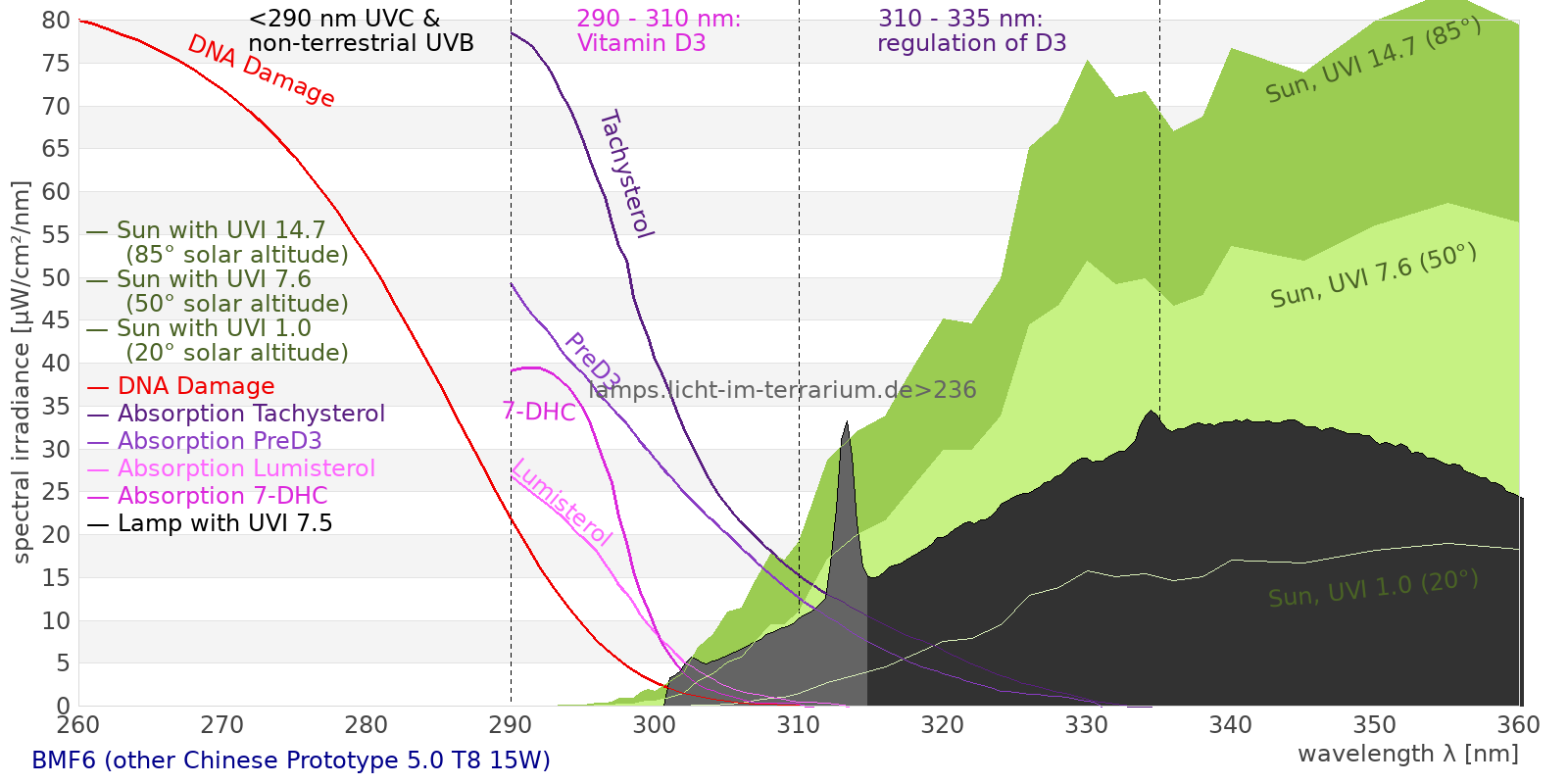 Erythema 0.899 UV-Index Pyrimidine dimerization of DNA 11.5 µW/cm² Photoceratitis 1.46 µW/cm² Photoconjunctivitis 0.0171 µW/cm² DNA Damage 0.0522 Vitamin D3 4.33 µW/cm² Photosynthesis 281 µW/cm² Luminosity 991 lx Human L-Cone 144 µW/cm² Human M-Cone 132 µW/cm² Human S-Cone 122 µW/cm² CIE X 131 µW/cm² CIE Y 137 µW/cm² CIE Z 223 µW/cm² PAR PPFD 18.9 µmol/m²/s Extinction preD3 30.8 e-3*m²/mol Extinction Tachysterol 108 e-3*m²/mol Exctincition PreD3 15000 m²/mol Extinction Lumisterol 2.86 m²/mol Exctincition Tachysterol 166000 m²/mol Extinction 7DHC 1.41 m²/mol L-Cone 115 µW/cm² M-Cone 142 µW/cm² S-Cone 223 µW/cm² U-Cone 189 µW/cm² UVR - ICNIRP 2004 0.588 Rel Biol Eff Melatonin Supression 162 µW/cm² Blue Light Hazard 140 µW/cm² (142 µW/cm² per 1000 lx) CIE 174:2006 PreVit D3 4.89 µW/cm² Lumen Reptil 1380 "pseudo-lx" Vitamin D3 Degradation 5.69 µW/cm² Actinic UV 0.579 µW/cm² (5.85 mW/klm) Exctincition Lumisterol 4790 m²/mol Exctincition 7DHC 2060 m²/mol Exctincition Toxisterols 2990 m²/mol