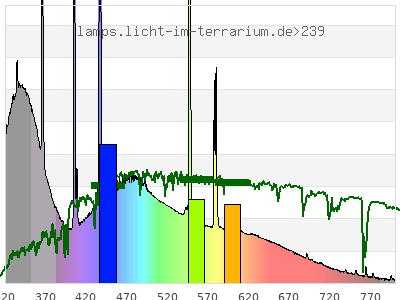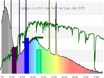 Whereas a spectrometer measures the intensity in every tiny wavelength interval resulting in thousands of individual intensities, the human eye only measures three intensities detected by the three cones. The same is true for the reptile eye with usually three or four photoreceptors. Effectively the detailled spectrum displayed above reduces to a much compacter bar graph displayed below. The photoreceptor sensitivites from these L-Cone, M-Cone, S-Cone, and U-Cone are used, they are chosen as an average of measured reptile photoreceptor sensitivity curves. The bar graph also shows as reference the intensity seen by the three or four photoreceptors for average sunlight (ASTM spectrum).
