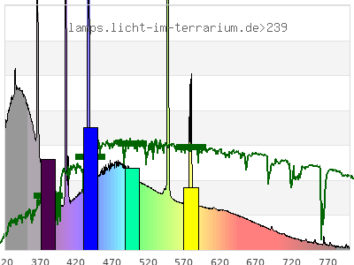 total ( 0 nm - 0 nm) 645 µW/cm² = 6.45 W/m² UVC ( 0 nm - 280 nm) 0.198 µW/cm² = 0.00198 W/m² non-terrestrial ( 0 nm - 290 nm) 0.612 µW/cm² = 0.00612 W/m² total2 ( 250 nm - 880 nm) 645 µW/cm² = 6.45 W/m² UVB (EU) ( 280 nm - 315 nm) 34.1 µW/cm² = 0.341 W/m² UVB (US) ( 280 nm - 320 nm) 45 µW/cm² = 0.45 W/m² UVA+B ( 280 nm - 380 nm) 203 µW/cm² = 2.03 W/m² Solar UVB ( 290 nm - 315 nm) 33.7 µW/cm² = 0.337 W/m² UVA D3 regulating ( 315 nm - 335 nm) 52.5 µW/cm² = 0.525 W/m² UVA (EU) ( 315 nm - 380 nm) 169 µW/cm² = 1.69 W/m² UVA2 (medical definition) ( 320 nm - 340 nm) 57.7 µW/cm² = 0.577 W/m² UVA (US) ( 320 nm - 380 nm) 158 µW/cm² = 1.58 W/m² UVA1 (variant) ( 335 nm - 380 nm) 116 µW/cm² = 1.16 W/m² UVA1 (medical) ( 340 nm - 400 nm) 120 µW/cm² = 1.2 W/m² vis. UVA ( 350 nm - 380 nm) 70.1 µW/cm² = 0.701 W/m² VIS Rep3 ( 350 nm - 600 nm) 432 µW/cm² = 4.32 W/m² VIS Rep4 ( 350 nm - 700 nm) 494 µW/cm² = 4.94 W/m² purple ( 380 nm - 420 nm) 59.1 µW/cm² = 0.591 W/m² VIS ( 380 nm - 780 nm) 439 µW/cm² = 4.39 W/m² VIS2 ( 400 nm - 680 nm) 395 µW/cm² = 3.95 W/m² PAR ( 400 nm - 700 nm) 404 µW/cm² = 4.04 W/m² tmp ( 400 nm - 1100 nm) 422 µW/cm² = 4.22 W/m² blue ( 420 nm - 490 nm) 149 µW/cm² = 1.49 W/m² green ( 490 nm - 575 nm) 124 µW/cm² = 1.24 W/m² yellow ( 575 nm - 585 nm) 16.5 µW/cm² = 0.165 W/m² orange ( 585 nm - 650 nm) 50 µW/cm² = 0.5 W/m² red ( 650 nm - 780 nm) 39.7 µW/cm² = 0.397 W/m² IR2 ( 655 nm - 685 nm) 15.5 µW/cm² = 0.155 W/m² IRA ( 700 nm - 1400 nm) 18.6 µW/cm² = 0.186 W/m² IRB ( 1400 nm - 3000 nm) 0 µW/cm² = 0 W/m²