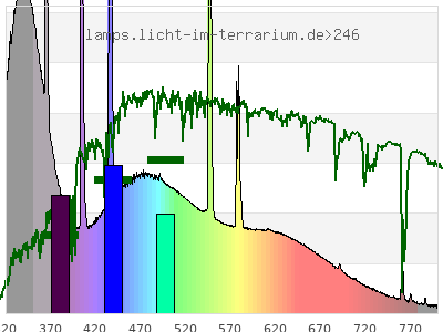 total ( 0 nm - 0 nm) 703 µW/cm² = 7.03 W/m² UVC ( 0 nm - 280 nm) 1.36 µW/cm² = 0.0136 W/m² non-terrestrial ( 0 nm - 290 nm) 2.25 µW/cm² = 0.0225 W/m² total2 ( 250 nm - 880 nm) 703 µW/cm² = 7.03 W/m² UVB (EU) ( 280 nm - 315 nm) 33 µW/cm² = 0.33 W/m² UVB (US) ( 280 nm - 320 nm) 45.5 µW/cm² = 0.455 W/m² UVA+B ( 280 nm - 380 nm) 229 µW/cm² = 2.29 W/m² Solar UVB ( 290 nm - 315 nm) 32.1 µW/cm² = 0.321 W/m² UVA D3 regulating ( 315 nm - 335 nm) 60.9 µW/cm² = 0.609 W/m² UVA (EU) ( 315 nm - 380 nm) 196 µW/cm² = 1.96 W/m² UVA2 (medical definition) ( 320 nm - 340 nm) 67.6 µW/cm² = 0.676 W/m² UVA (US) ( 320 nm - 380 nm) 183 µW/cm² = 1.83 W/m² UVA1 (variant) ( 335 nm - 380 nm) 135 µW/cm² = 1.35 W/m² UVA1 (medical) ( 340 nm - 400 nm) 138 µW/cm² = 1.38 W/m² vis. UVA ( 350 nm - 380 nm) 79.5 µW/cm² = 0.795 W/m² VIS Rep3 ( 350 nm - 600 nm) 449 µW/cm² = 4.49 W/m² VIS Rep4 ( 350 nm - 700 nm) 524 µW/cm² = 5.24 W/m² purple ( 380 nm - 420 nm) 60.5 µW/cm² = 0.605 W/m² VIS ( 380 nm - 780 nm) 465 µW/cm² = 4.65 W/m² VIS2 ( 400 nm - 680 nm) 412 µW/cm² = 4.12 W/m² PAR ( 400 nm - 700 nm) 422 µW/cm² = 4.22 W/m² tmp ( 400 nm - 1100 nm) 451 µW/cm² = 4.51 W/m² blue ( 420 nm - 490 nm) 149 µW/cm² = 1.49 W/m² green ( 490 nm - 575 nm) 129 µW/cm² = 1.29 W/m² yellow ( 575 nm - 585 nm) 16.5 µW/cm² = 0.165 W/m² orange ( 585 nm - 650 nm) 59 µW/cm² = 0.59 W/m² red ( 650 nm - 780 nm) 51.2 µW/cm² = 0.512 W/m² IR2 ( 655 nm - 685 nm) 19.4 µW/cm² = 0.194 W/m² IRA ( 700 nm - 1400 nm) 29.1 µW/cm² = 0.291 W/m² IRB ( 1400 nm - 3000 nm) 0 µW/cm² = 0 W/m²