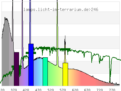 Whereas a spectrometer measures the intensity in every tiny wavelength interval resulting in thousands of individual intensities, the human eye only measures three intensities detected by the three cones. The same is true for the reptile eye with usually three or four photoreceptors. Effectively the detailled spectrum displayed above reduces to a much compacter bar graph displayed below. The photoreceptor sensitivites from these L-Cone, M-Cone, S-Cone, and U-Cone are used, they are chosen as an average of measured reptile photoreceptor sensitivity curves. The bar graph also shows as reference the intensity seen by the three or four photoreceptors for average sunlight (ASTM spectrum).