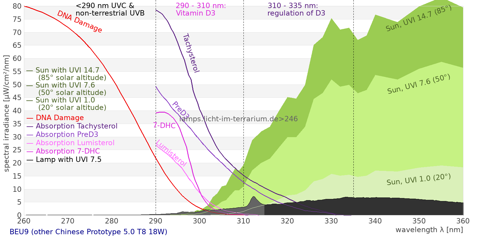 Erythema 4.4 UV-Index Pyrimidine dimerization of DNA 20.4 µW/cm² Photoceratitis 6.26 µW/cm² Photoconjunctivitis 1.46 µW/cm² DNA Damage 2.18 Vitamin D3 13.8 µW/cm² Photosynthesis 303 µW/cm² Luminosity 1070 lx Human L-Cone 156 µW/cm² Human M-Cone 143 µW/cm² Human S-Cone 127 µW/cm² CIE X 142 µW/cm² CIE Y 149 µW/cm² CIE Z 232 µW/cm² PAR PPFD 20.1 µmol/m²/s Extinction preD3 78.1 e-3*m²/mol Extinction Tachysterol 264 e-3*m²/mol Exctincition PreD3 46200 m²/mol Extinction Lumisterol 34.1 m²/mol Exctincition Tachysterol 363000 m²/mol Extinction 7DHC 40.6 m²/mol L-Cone 125 µW/cm² M-Cone 155 µW/cm² S-Cone 230 µW/cm² U-Cone 183 µW/cm² UVR - ICNIRP 2004 5.22 Rel Biol Eff Melatonin Supression 169 µW/cm² Blue Light Hazard 146 µW/cm² (136 µW/cm² per 1000 lx) CIE 174:2006 PreVit D3 14.8 µW/cm² Lumen Reptil 1450 "pseudo-lx" Vitamin D3 Degradation 10.8 µW/cm² Actinic UV 5.17 µW/cm² (48.1 mW/klm) Exctincition Lumisterol 40400 m²/mol Exctincition 7DHC 46800 m²/mol Exctincition Toxisterols 10100 m²/mol