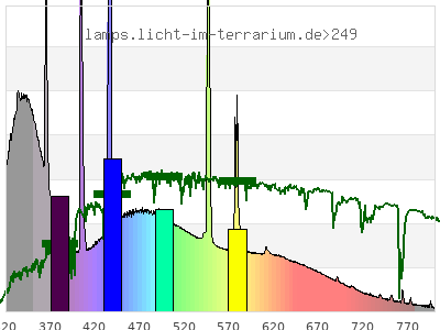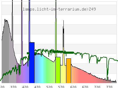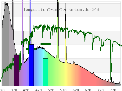 total ( 0 nm - 0 nm) 786 µW/cm² = 7.86 W/m² UVC ( 0 nm - 280 nm) 1.7 µW/cm² = 0.017 W/m² non-terrestrial ( 0 nm - 290 nm) 2.48 µW/cm² = 0.0248 W/m² total2 ( 250 nm - 880 nm) 786 µW/cm² = 7.86 W/m² UVB (EU) ( 280 nm - 315 nm) 31.3 µW/cm² = 0.313 W/m² UVB (US) ( 280 nm - 320 nm) 43.8 µW/cm² = 0.438 W/m² UVA+B ( 280 nm - 380 nm) 237 µW/cm² = 2.37 W/m² Solar UVB ( 290 nm - 315 nm) 30.5 µW/cm² = 0.305 W/m² UVA D3 regulating ( 315 nm - 335 nm) 62.2 µW/cm² = 0.622 W/m² UVA (EU) ( 315 nm - 380 nm) 206 µW/cm² = 2.06 W/m² UVA2 (medical definition) ( 320 nm - 340 nm) 70 µW/cm² = 0.7 W/m² UVA (US) ( 320 nm - 380 nm) 193 µW/cm² = 1.93 W/m² UVA1 (variant) ( 335 nm - 380 nm) 143 µW/cm² = 1.43 W/m² UVA1 (medical) ( 340 nm - 400 nm) 148 µW/cm² = 1.48 W/m² vis. UVA ( 350 nm - 380 nm) 85.3 µW/cm² = 0.853 W/m² VIS Rep3 ( 350 nm - 600 nm) 520 µW/cm² = 5.2 W/m² VIS Rep4 ( 350 nm - 700 nm) 604 µW/cm² = 6.04 W/m² purple ( 380 nm - 420 nm) 71.1 µW/cm² = 0.711 W/m² VIS ( 380 nm - 780 nm) 542 µW/cm² = 5.42 W/m² VIS2 ( 400 nm - 680 nm) 483 µW/cm² = 4.83 W/m² PAR ( 400 nm - 700 nm) 495 µW/cm² = 4.95 W/m² tmp ( 400 nm - 1100 nm) 523 µW/cm² = 5.23 W/m² blue ( 420 nm - 490 nm) 175 µW/cm² = 1.75 W/m² green ( 490 nm - 575 nm) 151 µW/cm² = 1.51 W/m² yellow ( 575 nm - 585 nm) 21.2 µW/cm² = 0.212 W/m² orange ( 585 nm - 650 nm) 66.4 µW/cm² = 0.664 W/m² red ( 650 nm - 780 nm) 56.6 µW/cm² = 0.566 W/m² IR2 ( 655 nm - 685 nm) 21.5 µW/cm² = 0.215 W/m² IRA ( 700 nm - 1400 nm) 28.5 µW/cm² = 0.285 W/m² IRB ( 1400 nm - 3000 nm) 0 µW/cm² = 0 W/m²